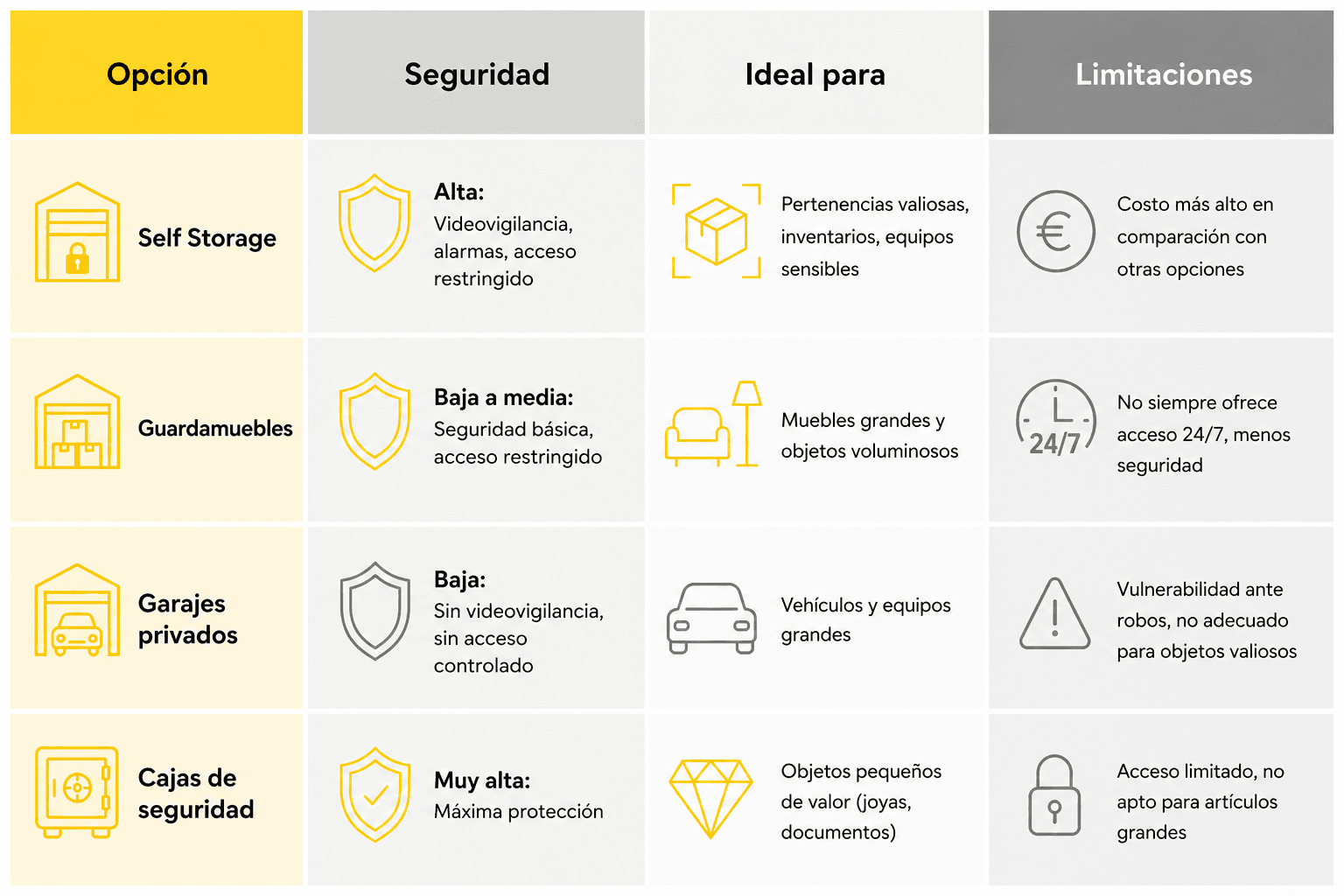 Si la seguridad es tu principal preocupación, un trastero de self storage es la opción ideal para proteger tus pertenencias de forma eficiente y segura. Si necesitas almacenar objetos de valor personal o confidencial, las cajas de seguridad en bancos son una excelente opción. Para objetos grandes y voluminosos, los guardamuebles tradicionales o garajes privados pueden ser suficientes, pero siempre recuerda evaluar el nivel de seguridad que ofrecen.